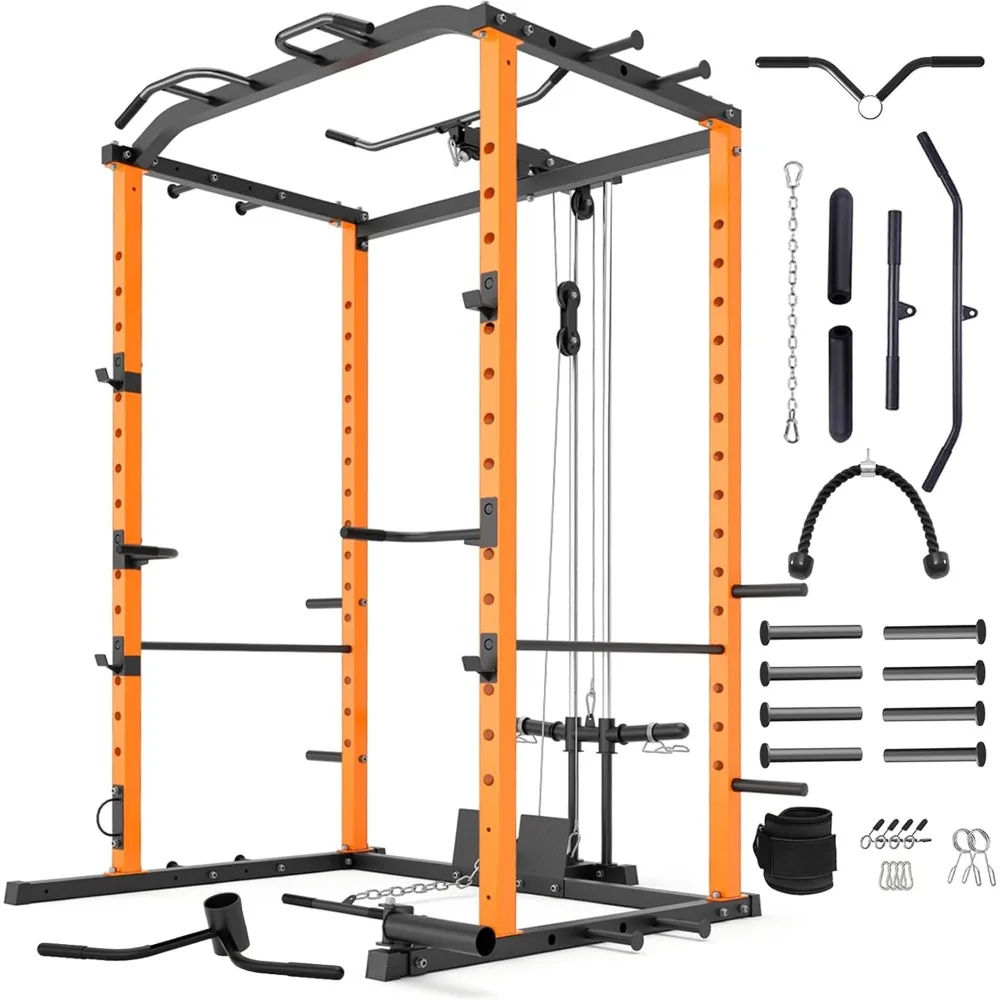 • 【2024 Updated Version】We have updated our power cage with removable foot plate, T bar handle, landmine attachment, band pegs and more. Meanwhile we have changed the connecting construction with durable carriage bolts which has successfully solved the side to side wobbling problem