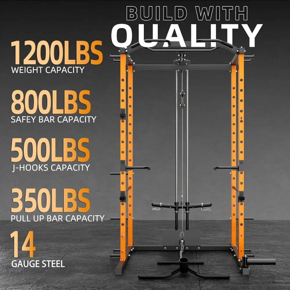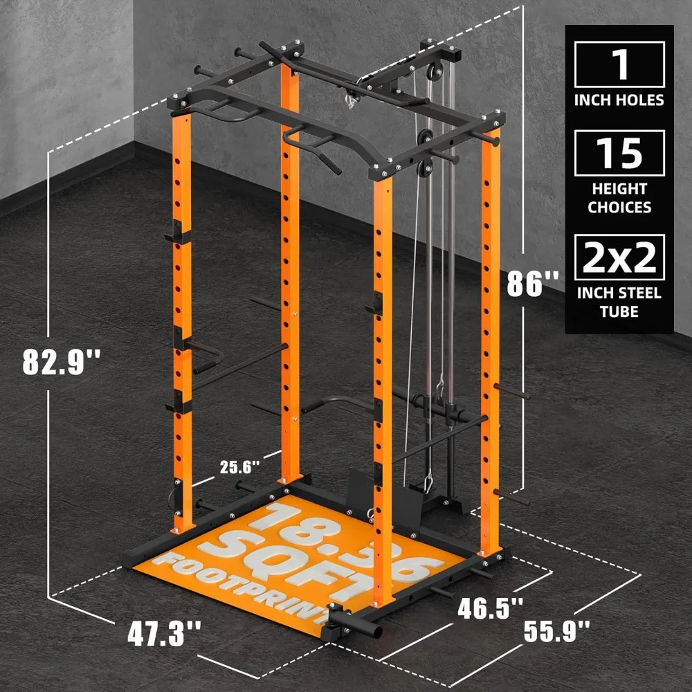 • 【Stable Structure】 Made from durable 14 gauge steel with sturdy 2" x 2" frames, this power rack is built to last. Gross Weight: 173 lbs. With dimensions of 47.3" W x 55.9" D x 86" H, it's perfectly sized for your home and garage. Ideal for optimizing your workout space