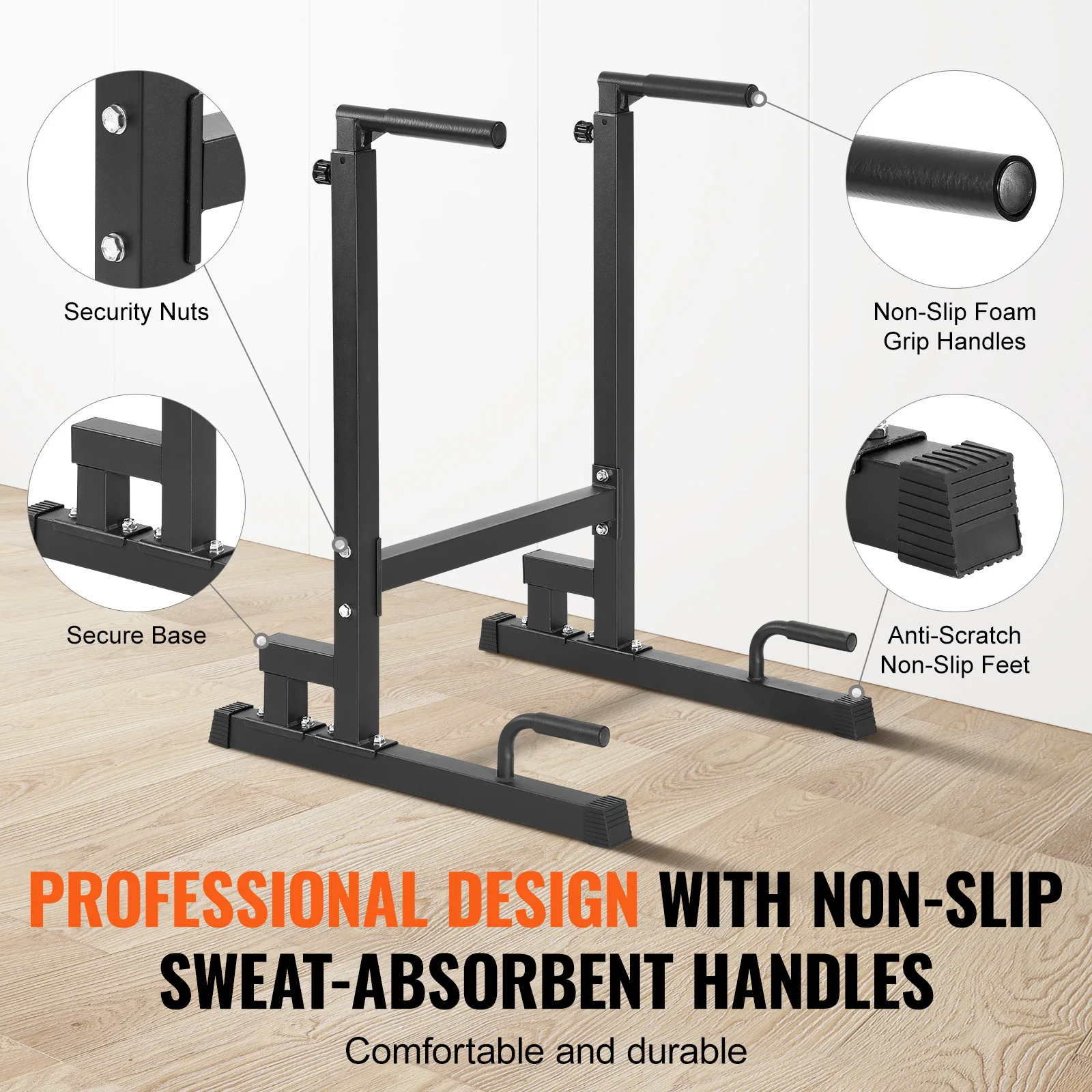 Enjoy a comfortable grip with our dip stand's ergonomic foam handles, reducing hand fatigue and enhancing your workout experience. The rubber feet ensure stability and floor protection, so you can focus on your reps without worrying about slips or damage.