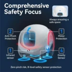 - 8-level Safety Features: Your cat's safety comes first and is our top priority. This litter box is equipped with 4 gravity sensors, 2 anti-pinch protections, 1 infrared sensor, and a safety motor. The automatic cat litter box self cleaning automatically stops when your cat is nearby, preventing accidents and keeping your pet safe at all times