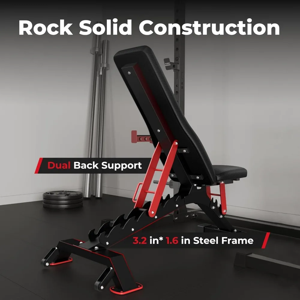 - 【Commercial Gym Quality】 Crafted with commercial grade 3.2*1.6 in tubular steel and 0.2 in iron sheet, this weight bench can handle intense workouts with ease. Every weld is clean and well-filled. The matte finish prevents any paint peeling. Heavy-duty materials and integrated steel structure provide exceptional strength, stability and longevity to this exercise bench.